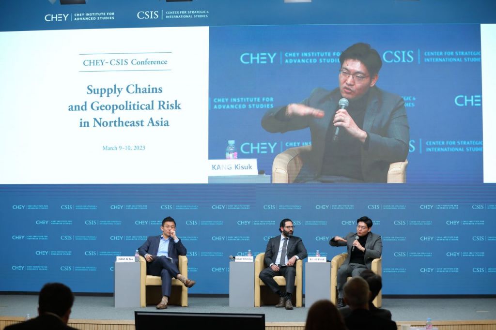 최종현학술원이 미국 싱크탱크인 전략국제문제연구소(CSIS)와 주최한 서울 컨퍼런스에서 남기태 서울대 재료공학부 교수(맨 왼쪽)와 미국 랜드연구소 파비앙 빌라로보스 박사(가운데)가 강기석 서울대 재료공학부 교수(맨 오른쪽) 발언을 듣고 있다. [사진제공=최종현학술원]