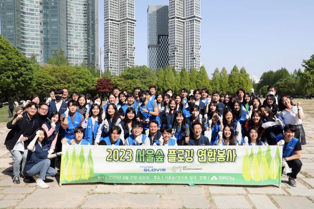 환경정화 활동에 참여한 현대글로비스, SM엔터테인먼트 임직원이 기념 촬영을 하고 있다. [사진제공=현대글로비스]
