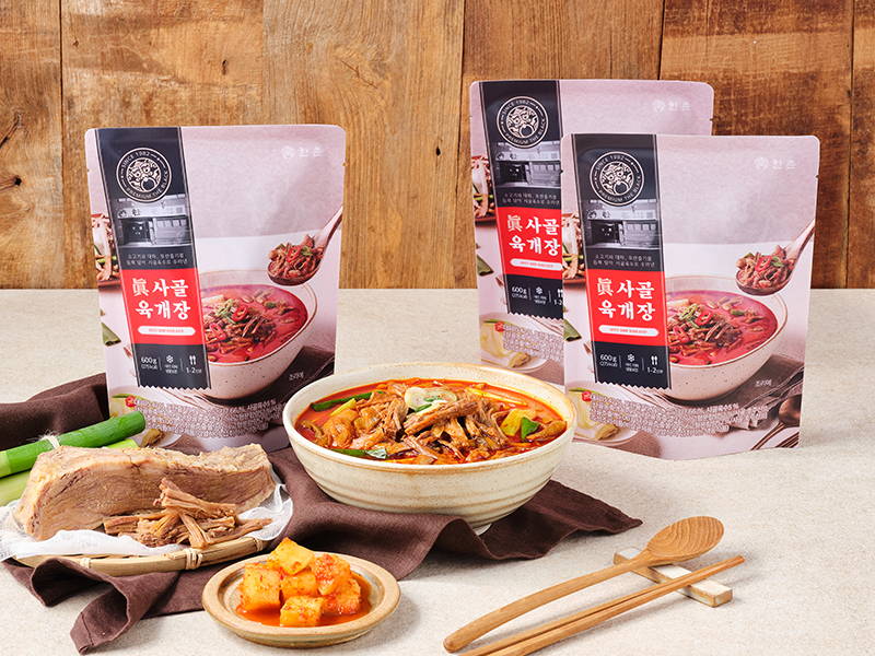 신제품은 ‘진(眞)사골육개장’으로, 진한 사골육수 베이스에 두툼하게 찢어낸 양지, 식이섬유와 배타카로틴이 풍부한 토란 줄기, 시원함과 담백함을 위해 대파 등을 푸짐하게 넣은 것이 특징이다.