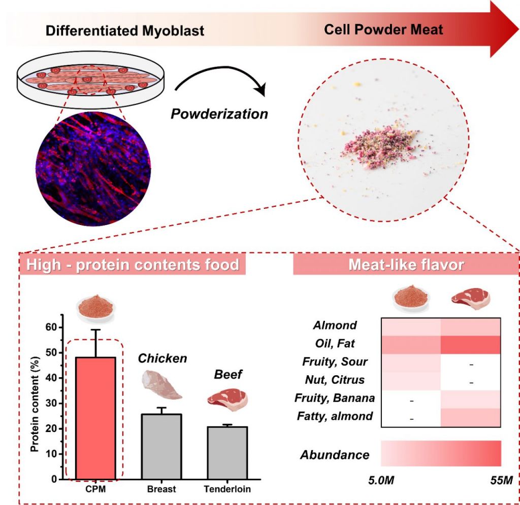 연구팀은 세포의 높은 분화율을 달성해 고단백을 함유할 수 있는 세포 배양 조건을 정립하고, 기존의 관습적인 배양 조건에 비해 약 76% 높은 가격 효율성으로 세포를 배양해 파우더 형태의 새로운 배양육을 제조했다. 고단백 식품이라고 잘 알려진 소고기 안심(단백질 함량: 20.7%), 닭가슴살(단백질 함량: 25.7%)과 비교해도 훨씬 높은 단백질 함량인 48.1%를 나타내는 것이 특징이다.