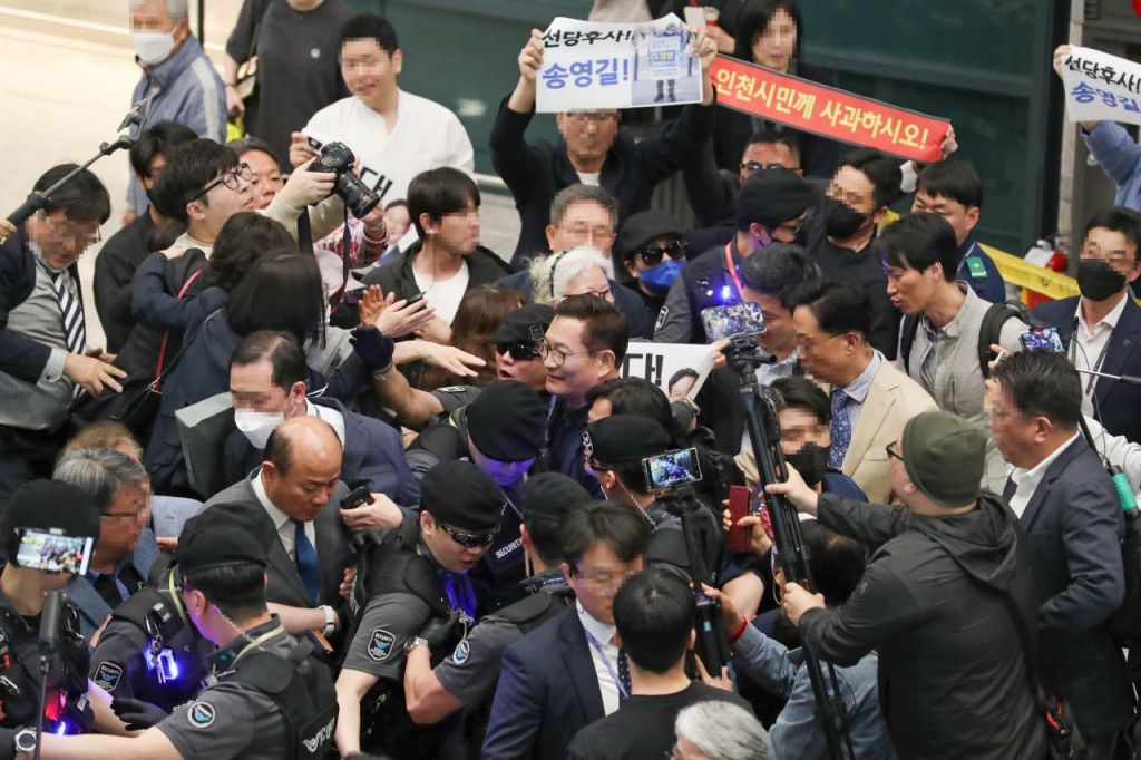 이날 공항에는 취재진과 송 전 대표 지지자와 반대자 200여명이 엉켜 혼잡했다. 송 전 대표 지지자들은 '믿는다 송영길', '우리는 민주당 동지' 등의 현수막을 흔들며 "송영길"을 연호했고, 반대자들은 "송영길을 구속하라"고 외치기도 했다. 쪽지를 건넨 여성이 지지자인지, 반대자인지는 확인되지 않았다.