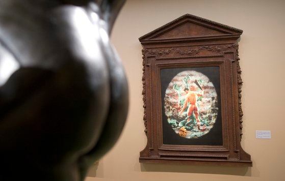 2013년 오르세 미술관에 전시된 프랑스 조각가 앙토냉 메르시에의 작품 '다비드'(왼쪽)의 뒷부분 일부와 프랑스 화가 피에르와 질의 작품 '레르나의 히드라와 맞서는 헤라클레스'(오른쪽). EPA=연합뉴스