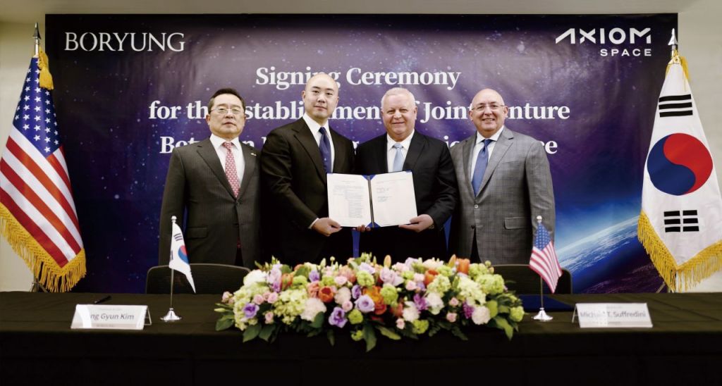 보령은 미국 액시엄 스페이스와 25일(현지시간) 미국 워싱턴에서 지구 저궤도(LEO) 상에서 공동 우주 사업을 추진하기 위한 조인트 벤처(JV) 설립 계약을 체결했다고 26일 밝혔다. 이날 체결식에는 김정균 보령 대표와 액시엄의 캄 가파리안 회장·마이클 서프레디니 대표 등 양사 관계자와 구자열 무역협회장이 참석했다.