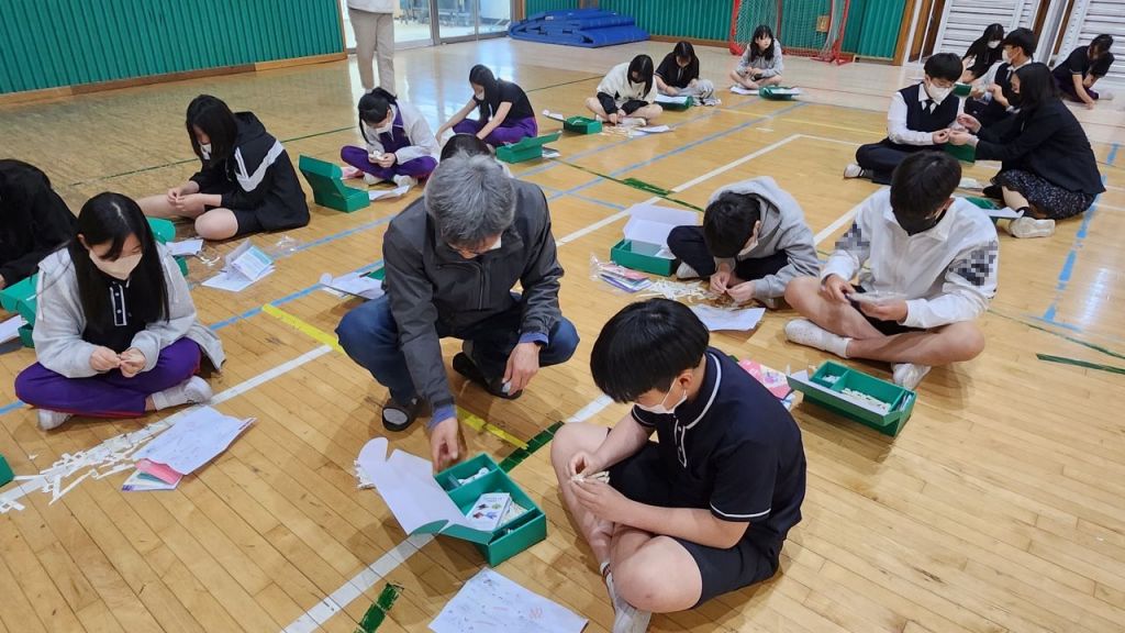 경남 창원 사파중학교 학생들이 경남교육청 직업교육 혁신지구 전공 직업 체험 교육에서 종이 드론을 만들고 있다. [사진제공=경남교육청]