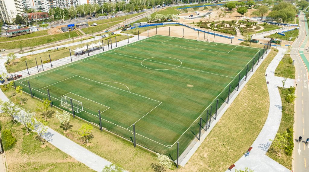 새롭게 탄생한 축구장은 바닥에 가로 101m, 세로 71m 총 7171㎡ 인조잔디를 깔고, 하부에는 아스콘을 전면 타설해 잔디와의 밀착도를 높여 집중호우에도 분리되지 않도록 했다. 부드러운 질감의 인조잔디는 축구 경기 도중 발생하기 쉬운 부상 방지에도 효과적일 것으로 보인다.
