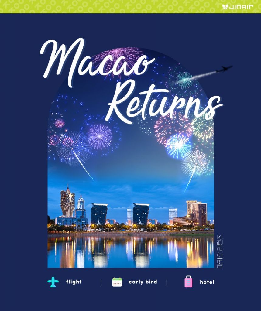 진에어는 “야간 편을 이용하면 2박 4일 일정으로 주말 동안 알차게 밤도깨비 해외여행을 다녀올 수 있다”며 “진에어와 함께 화려한 호텔 투어, 다양한 세계문화유산과 먹거리, 쇼핑 등 즐길거리가 풍부한 마카오 여행을 떠나보시길 적극 추천한다”고 말했다.