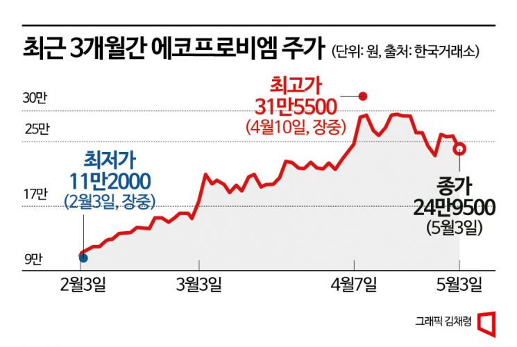 4일 한국거래소에 따르면 에코프로비엠은 3일 전거래일 대비 6.55% 하락한 24만9500원에 장을 마쳤다. 올해 첫 거래일인 1월2일 9만3400원(종가)을 기록한 에코프로비엠 주가는 지금까지 170% 올랐다. 4월10일 장중 최고 31만5500원을 기록한 후 한 차례 조정 국면을 거치고 등락을 거듭하고 있다.