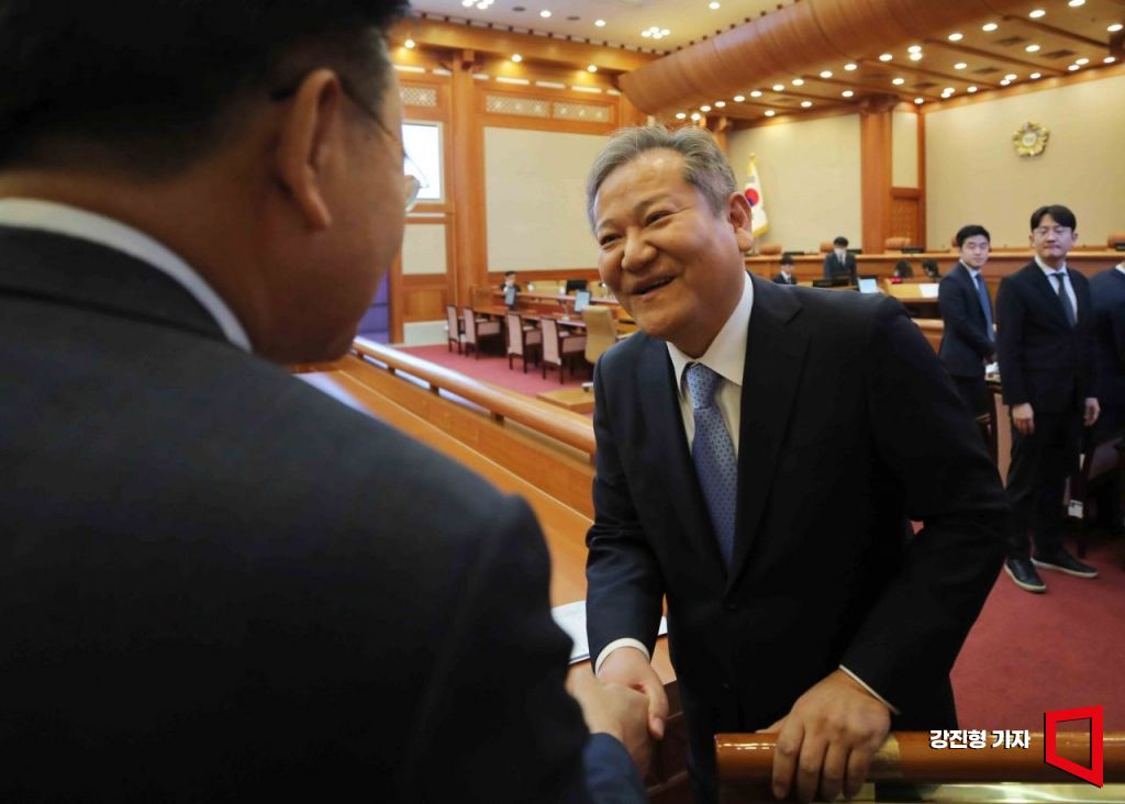 10.29 이태원 참사 부실 대응 논란으로 탄핵소추된 이상민 행정안전부 장관이 9일 오후 서울 종로구 헌법재판소 대심판정에서 열린 탄핵심판 1차 변론기일에서 유상범 의원과 인사 나누고 있다.