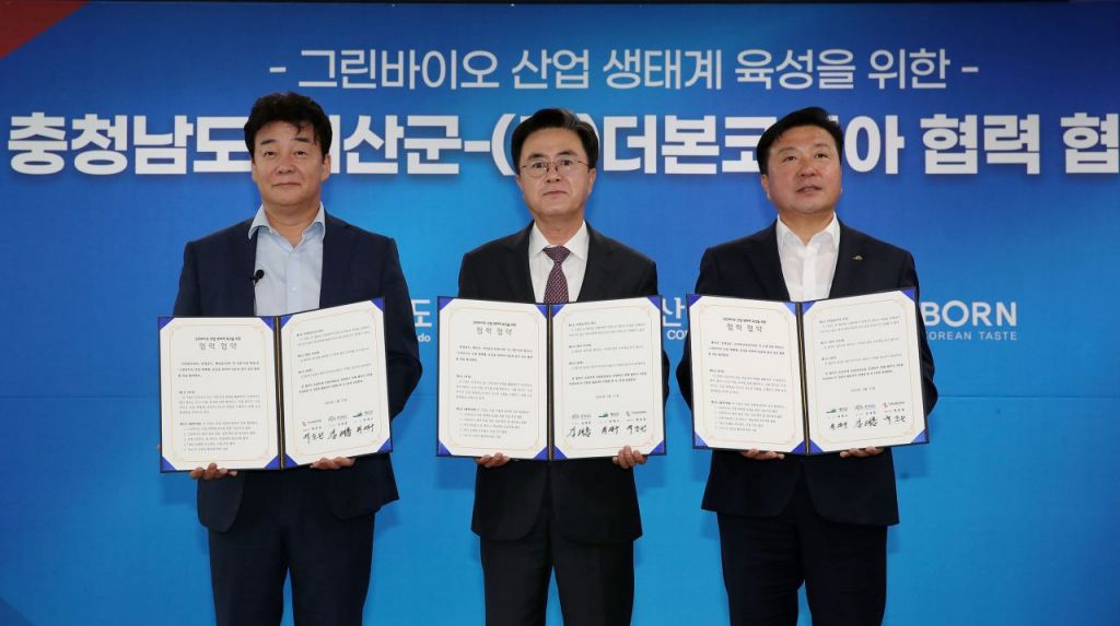 협약은 도와 예산군, 더본코리아가 그린바이오 산업 생태계 육성 관련 사업에 힘을 모으고 그린바이오 벤처 창업 지원과 국제 콘퍼런스 및 세미나·학술대회 공동 개최, 예산 늘해랑 프로젝트에 협력하는 내용을 골자로 체결됐다.