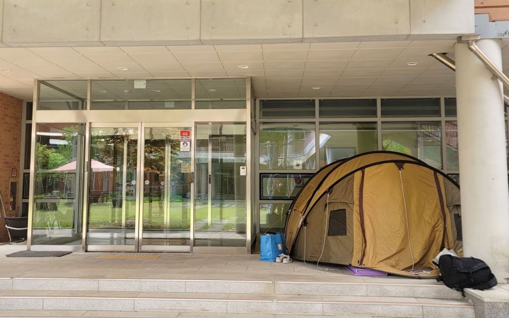 강원도 내 한 고등학교의 기숙사 앞 한쪽 구석에는 지난달 초부터 텐트 하나가 자리 잡고 있다. 이 텐트는 낮 동안에는 비어 있다가 새벽 1시쯤이면 이 학교의 교장이 들어가 새벽 6시까지 머무른다. 교장이 한 달 넘게 이런 불편한 생활을 이어가고 있는 이유는 학교 기숙사에서 근무하는 생활 지도원(사감)들의 근로 계약 문제 때문이다.