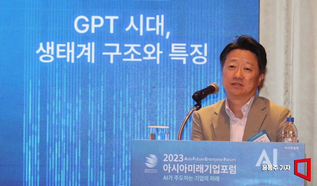아시아경제 주최로 17일 서울 중구 롯데호텔에서 열린 '2023 아시아미래기업포럼'에서 이상구 서울대 컴퓨터공학부 교수가 GPT 시대, 생태계 구조와 특징이라는 주제로 강연을 하고 있다. 사진=윤동주 기자 doso7@