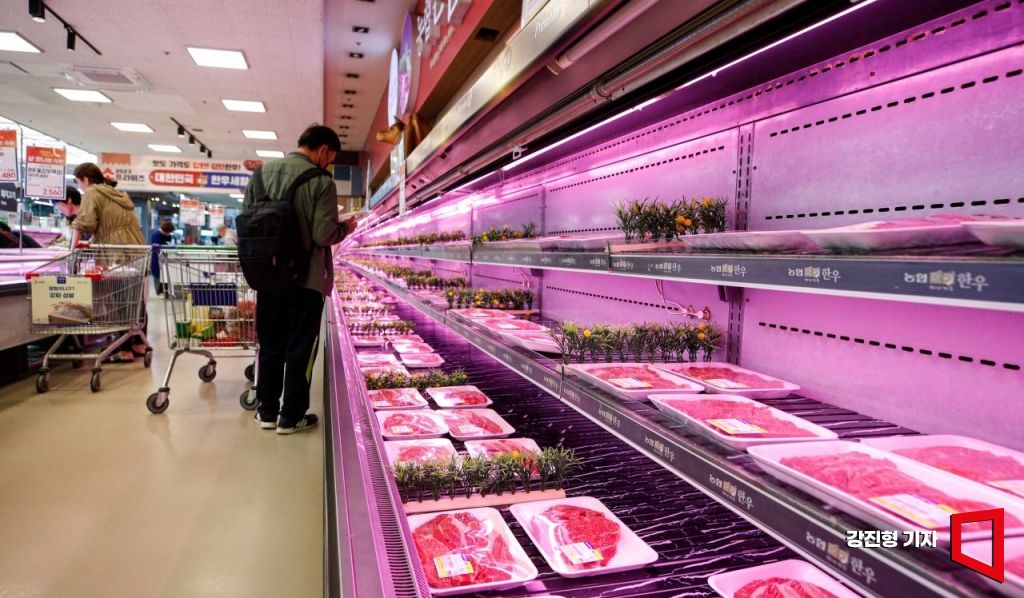 4년 만에 발생한 구제역 등으로 축산물 가격 상승이 예상되고 있는 22일 서울 서초구 양재하나로마트를 찾은 고객들이 한우를 보고 있다.