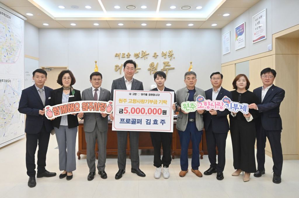 김효주는 22일 강원도 원주시청을 방문해 고향사랑기부금 500만원을 쾌척했다. 김효주는 원주 육민관중학교 출신이다. 한국여자프로골프(KLPGA)투어 14승, 미국여자프로골프(LPGA)투어 5승, 일본여자프로골프(JLPGA)투어 1승 등 전 세계 투어에서 통산 21승을 거둔 선수다. 김효주는 "몸은 비록 고향에서 멀리 떨어져 있지만 원주에 대한 따뜻한 추억은 항상 간직하고 있다"며 "고향 발전을 바라는 마음에서 이번 기부에 동참했다"고 설명했다.