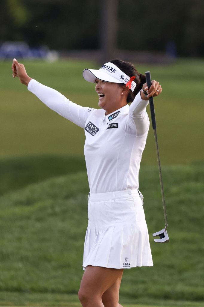고진영이 코그니전트 파운더스컵 우승 직후 환호하고 있다.[클리프턴(미국)=AFP·연합뉴스]