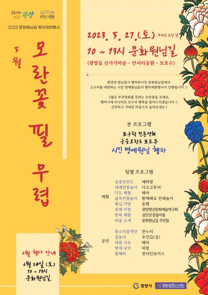 이번 회차는 ‘모란꽃 필 무렵’이라는 부제로 진행되며, 오는 27일 토요일 오전 10시부터 오후 1시까지 광양읍 인서리 154번지(보호수 앞 주차장) 일원에서 개최된다.