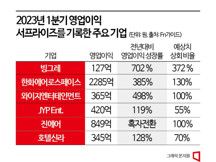 증권가에서는 특히 영업이익 서프라이즈와 이익 추정치 상향이 모두 플러스(+) 전환한 종목을 집중해야 한다는 조언이다. IBK투자증권에 따르면 영업이익 서프라이즈와 이익 추정치 변경이 모두 플러스 전환한 종목으로는 빙그레와 한화에어로스페이스, 와이지엔터테인먼트, 진에어, 호텔신라 등이 꼽혔다.