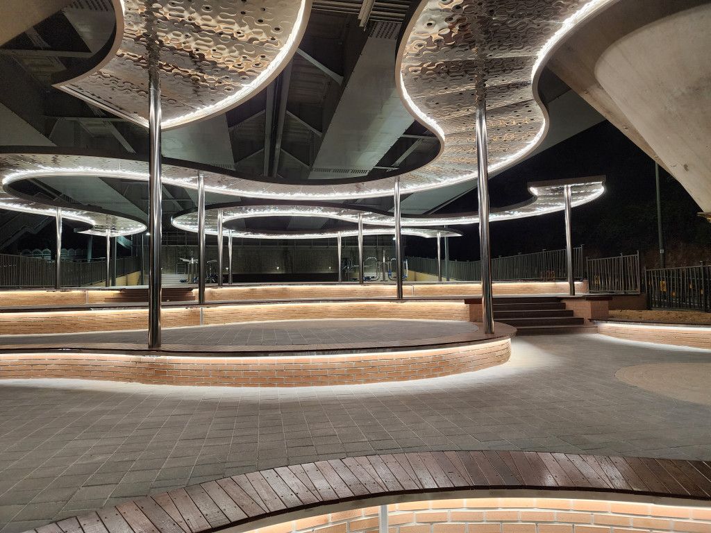 쉼터의 하이라이트는 천장 조명 시설로, 빛의 물결을 형상화한 지붕 구조가 하나의 흐름으로 이어지도록 디자인했다. 낮에는 물결처럼 반사되는 천장으로, 밤에는 반짝이며 흐르는 간접광으로, 전체 공간을 하나로 엮은 공공 테라스로 재탄생했다.
