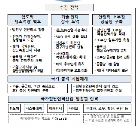 국가 총력 지원체계 구축을 위해 기술 지정 중심의 현행 기술조정위원회를 기술·투자·인력 등을 종합해 논의하는 ‘첨단전략산업조정위’로 개편하기로 했다. 이와는 별개로 통상 규범, 글로벌 기업 동향, 환경 규제 등 첨단산업 핵심정보 분석을 위한 씽크탱크로 산업연구원내 ‘첨단산업전략센터’ 설치도 검토 중이다.
