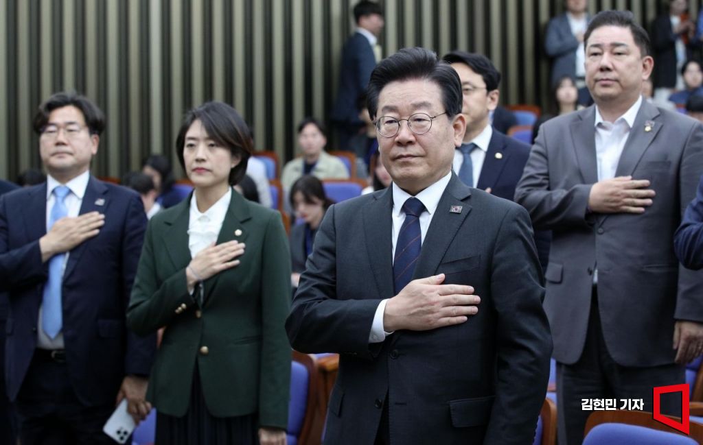 이재명 더불어민주당 대표가 25일 국회에서 열린 의원총회에서 국민의례를 하고 있다. 사진=김현민 기자 kimhyun81@