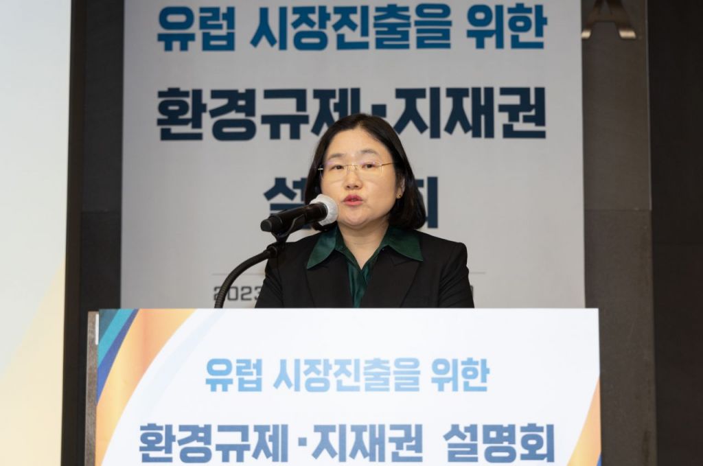 한국무역협회는 26일 삼성동 트레이드타워에서 ‘유럽 시장 진출을 위한 환경 규제·지재권 설명회’를 개최했다.김미애 한국무역협회 FTA 종합지원센터 단장이 개회사를 하고 있다.