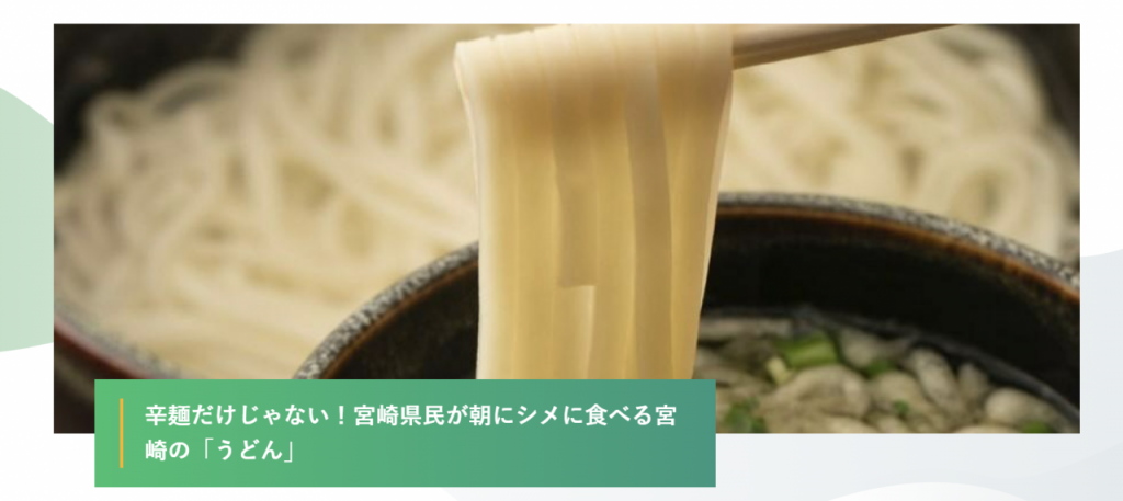 미야자키현 홈페이지의 우동 홍보글. '아침에도, 술자리 뒤에도 먹는 우동'이라고 소개하고 있다.(사진출처=미야자키현 홈페이지)