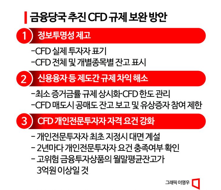 규제보완방안은 ▲CFD 관련 정보 투명성 제고 ▲신용융자 등 제도 간 규제 차익 해소 ▲개인 전문투자자 요건 강화 등 세 가지로 요약할 수 있다. 먼저 CFD 정보 공시를 강화해 실제 투자자가 개인임에도 형식상 외국계 혹은 국내 증권사로 표기되는 것을 바로잡아 투자자 오인을 방지할 계획이다. 또 신용융자잔고와 마찬가지로 개별 종목별, CFD 전체 잔고 등을 공시하도록 할 방침이다. 또 거래소 TR 보고항목에 투자자의 실제 정보를 추가해 시장 감시 용도로 활용한다.