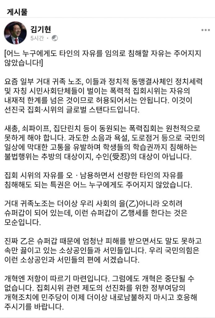 김기현 국민의힘 대표는 28일 페이스북에 "어느 누구에게도 타인의 자유를 임의로 침해할 자유는 주어지지 않았습니다"로 시작하는 글을 올렸다. 그는 "요즘 일부 거대 귀족 노조, 이들과 정치적 동맹결사체인 정치세력 및 자칭 시민사회단체들이 벌이는 폭력적 집회·시위는 자유의 내재적 한계를 넘은 것이므로 허용돼서는 안 된다"며 "이것이 선진국 집회·시위의 글로벌 스탠다드"라고 못 박았다.