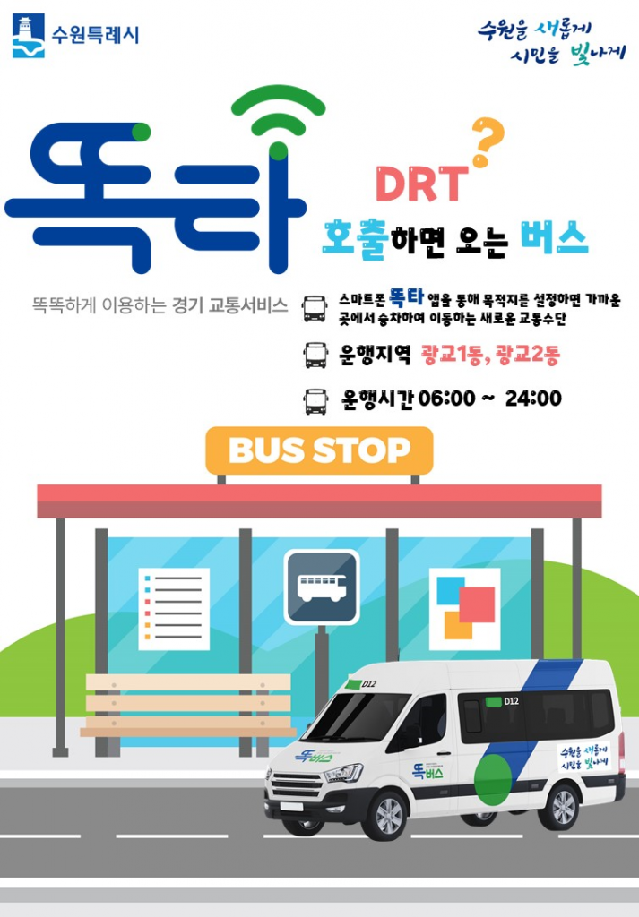 수원시 관계자는 "대중교통수단이 상대적으로 열악한 광교1ㆍ2동에 똑버스가 운행돼 시민들이 한결 편리하게 이동할 수 있을 것"이라며 "스마트폰 이용에 어려움을 겪는 어르신들을 위해 광교 지역 수원시 디지털배움터에서 똑타 앱 설치ㆍ이용 방법을 교육해 어르신들이 똑버스를 이용하실 수 있도록 지원하겠다"고 전했다.
