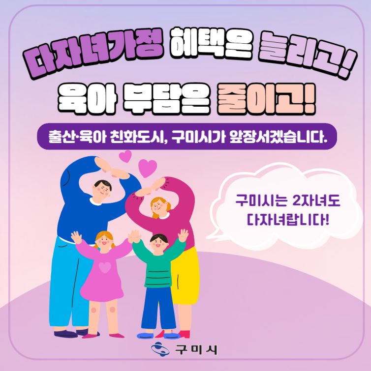 경북 구미시는 ‘아이 키우기 가장 좋은 도시 만들기’ 시책 사업의 일환으로 다자녀 가정에 대한 지원을 전면 확대한다.