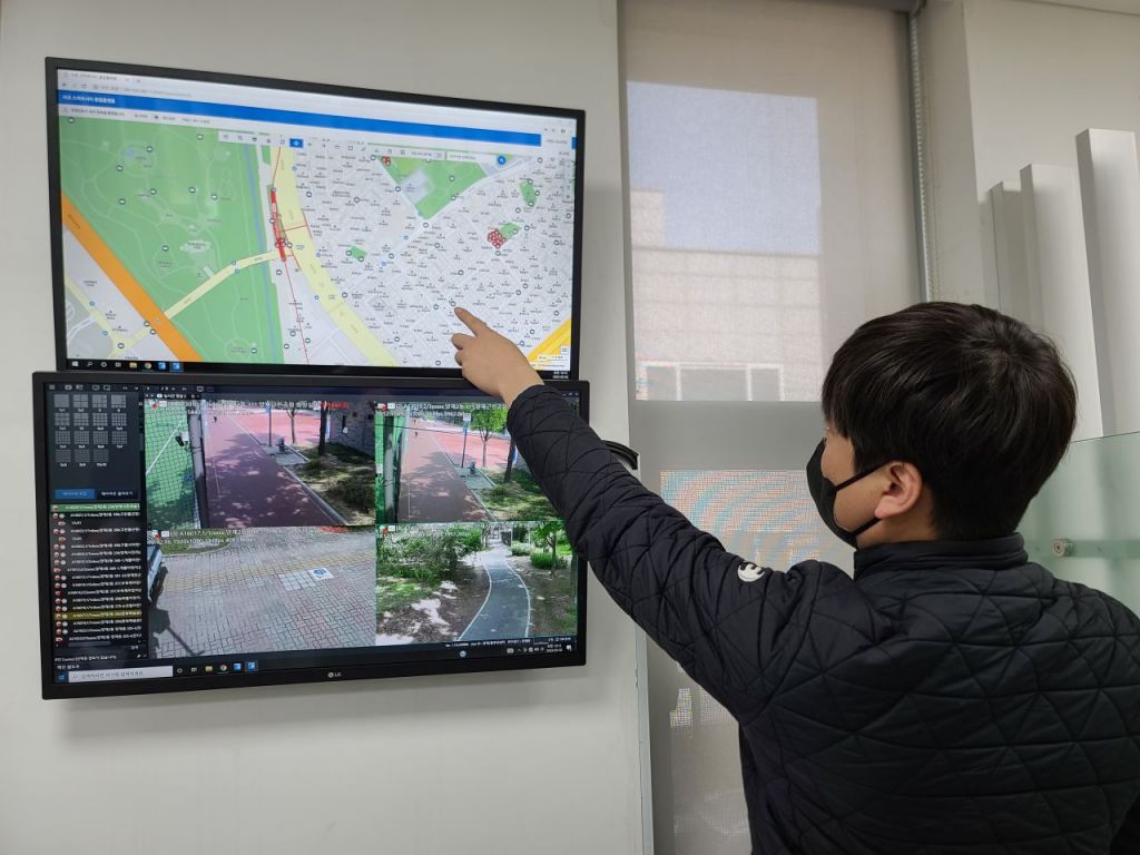 장비는 컴퓨터 1대, 모니터 2대, 각종 통신· 보안장비 등이 마련돼 있다. 이에 동담당자는 1대의 모니터로 영상관제시스템을 통해 실시간 상황을 파악, 나머지 모니터 1대로 어린이보호구역, 시설물 등 위치정보를 볼 수 있는 스마트시티 통합플랫폼도 제공받아 보다 쉽고 편리하게 확인할 수 있다.