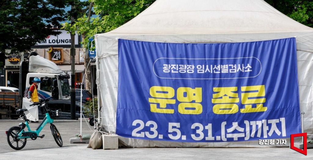 다음달 1일부터 코로나19 위기경보 수준이 '심각'에서 '경계로 하향되는 가운데 30일 서울 광진구 광진광장 임시선별검사소에 운영 종료를 알리는 안내 현수막이 걸려 있다.
