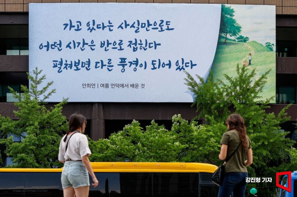 30일 서울 종로구 교보생명빌딩 외벽에 광화문글판 여름편이 공개되고 있다. 이번 광화문 글판 여름편은 안희연 시인의 시 '여름 언덕에서 배운 것'에서 발췌 했다.