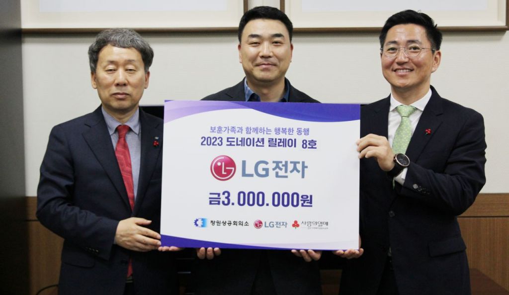 LG전자가 30일 경남 창원상공회의소와 경남사회복지공동모금회가 공동 추진하고 있는 보훈 가족과 함께하는 행복한 동행 ‘2023 도네이션 릴레이 캠페인’의 제8호 동행자로 참여하며 기부금 300만원을 전달했다.