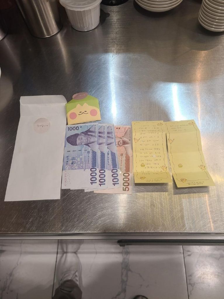 A씨가 올린 사진을 보면 8000원 지폐와 함께 학생이 쓴 것으로 보이는 편지가 있다. 노란 편지지에는 "짜장면과 음료 주신 거 너무너무 감사한데 공짜 받으면 조금 그래서 짜장면 가격을 조금이나마 준비했다"며 "나중에 커서 사장님처럼 베푸는 사람이 되도록 하겠다는 글이 적혀 있다.