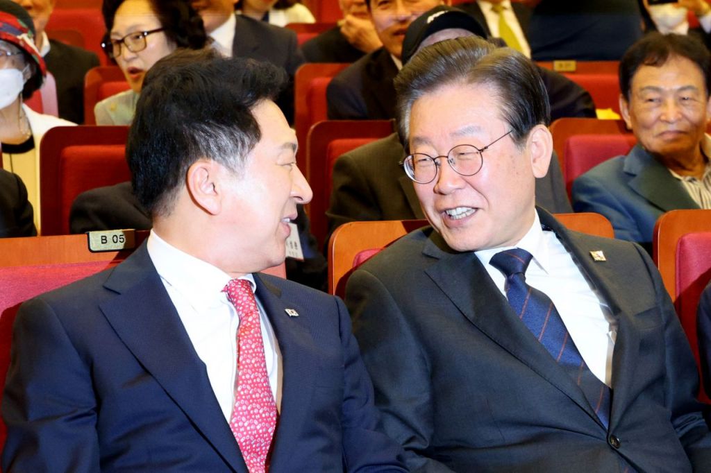 김기현 국민의힘 대표(왼쪽)와 이재명 더불어민주당 대표가 22일 오전 국회에서 열린 민주화추진협의회 결성 39주년 기념식에서 대화하고 있다. [이미지출처=연합뉴스]