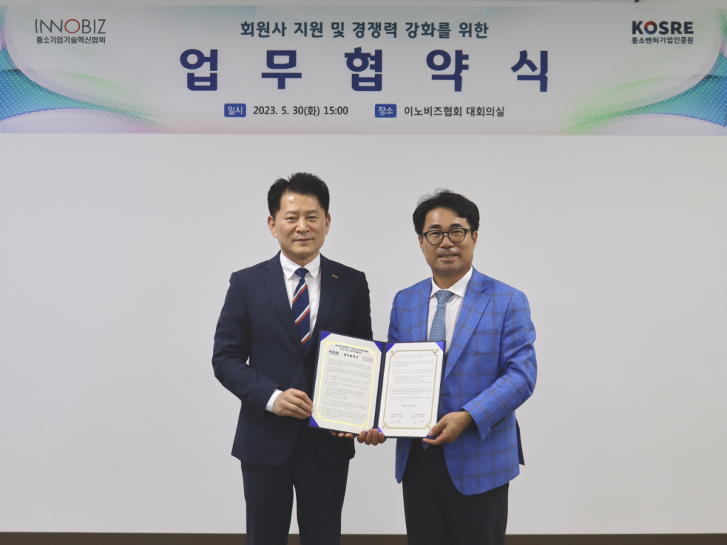 임병훈 이노비즈협회장(오른쪽)과 엄진엽 중소벤처기업인증원장이 업무협약을 체결하고 기념사진을 촬영하고 있다.