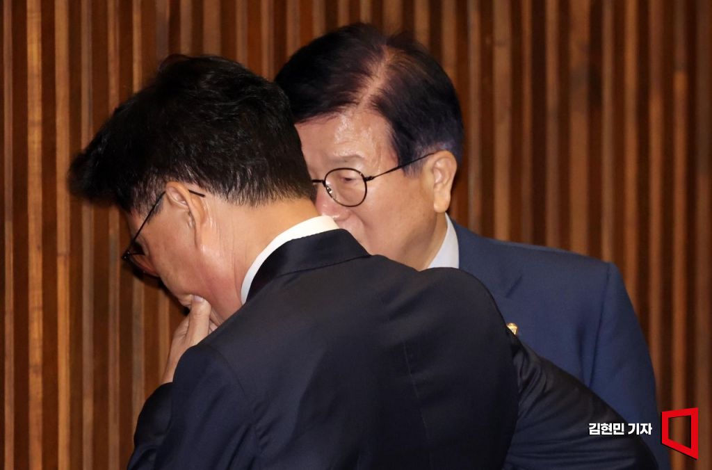 박광온 더불어민주당 원내대표가 30일 국회에서 열린 본회의에서 박병석 의원과 대화하고 있다. 사진=김현민 기자 kimhyun81@