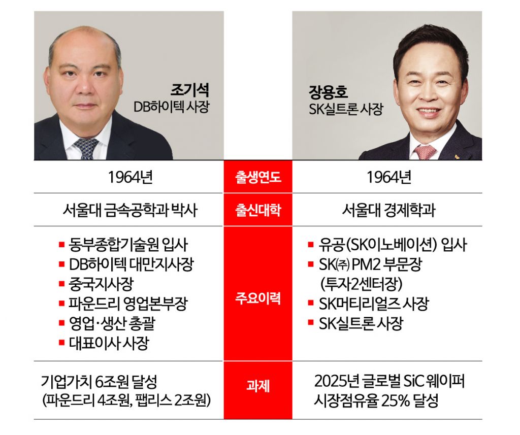 두 기업 리더는 1964년생 동문이다. 조기석 DB하이텍 대표는 서울대 금속공학과, 장용호 SK실트론 대표는 서울대 경제학과를 졸업했다. 둘 사이 학창 시절 접점은 없었던 것으로 전해졌다.