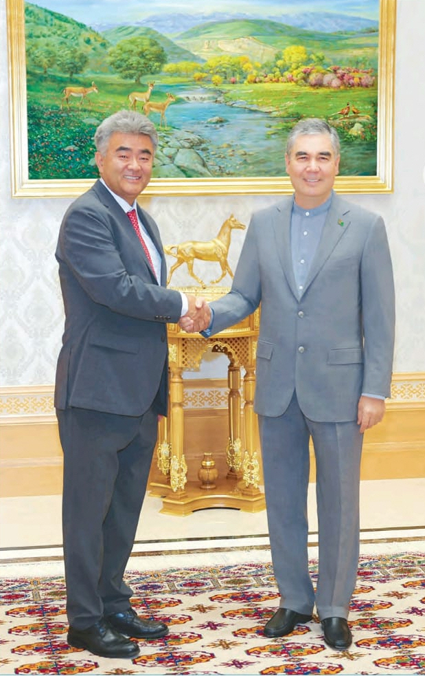 정원주 대우건설 회장이 지난 29일 투르크메니스탄 현지에서 구르반굴리 베르디무하메도프 국가최고지도자를 예방했다.