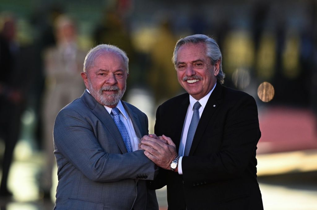 루이스 이나시우 룰라 다 시우바 브라질 대통령(왼쪽)이 지난 2일(현지시간) 수도 브라질리아의 대통령 관저인 아우보라다 궁에서 브라질을 방문한 알베르토 페르난데스 아르헨티나 대통령을 환영하고 있다. [사진=브라질리아 EPA/연합뉴스]