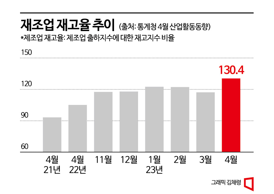 31일 통계청이 발표한 4월 산업활동동향에 따르면 지난달 제조업 재고율(재고지수/출하지수 × 100)은 130.4%로 전월대비 13.2%포인트 상승했다. 통계청이 1985년 제조업 재고율 통계를 작성하기 시작한 이래 가장 높은 수치를 기록했다. 김보경 통계청 경제동향통계심의관은 "이번달 생산이 1.2% 감소했지만, 출하가 4.6%로 더 많이 감소하면서 재고 증가폭이 커졌다"며 “출하가 줄면서 재고율 상승폭도 커졌다 "특히 반도체의 출하 감소 폭이 커 재고/출하 비율 자체가 상향했다"고 설명했다.