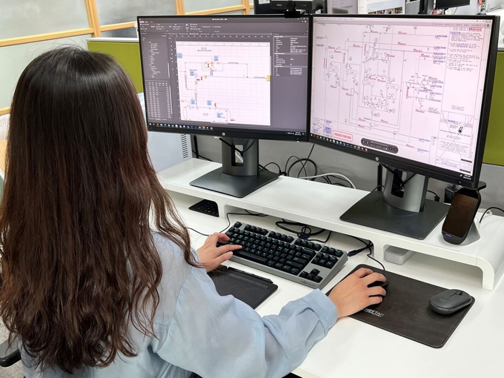 현대엔지니어링 직원이 ‘공정 배관 계장도(P&ID) 자동 인식 시스템’을 이용한 설계 도면 인식 테스트를 진행하고 있다.[사진 제공=현대엔지니어링]