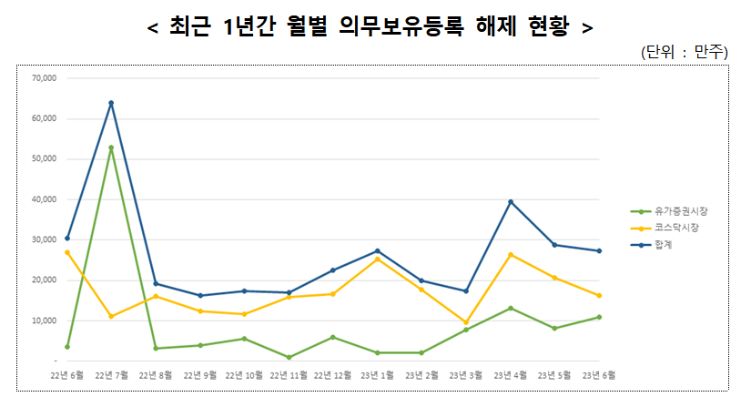 의무보유등록이 해제될 주식 수량은 전월(2억8776만주) 대비 5.1% 감소, 지난해 동월(3억424만주) 대비 10.2% 감소했다.