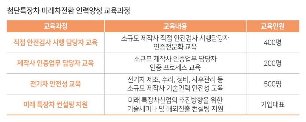 또 첨단장치를 장착한 전기차 등 미래차 보급이 가속화됨에 따라 전기차 고전원장치 안전성 교육을 통해 설계, 제작, 수리, 정비 등 전주기 측면에서의 특장차 업계 기술인력의 전문성을 향상시킨다는 방침이다.