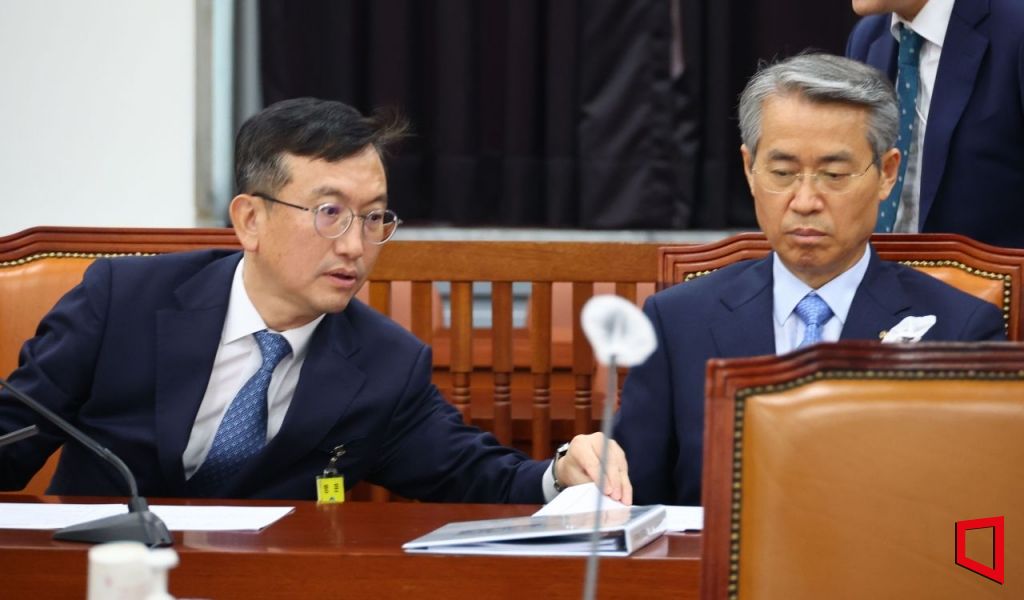 국회 정보위원회는 31일 전체회의를 열고 국가정보원을 대상으로 현안 질의를 가졌다. 이날 회의에서는 김규현 국정원장이 참석한 가운데 북한의 중앙선거관리위원회 해킹 시도 논란, 북한이 국제기구 등에 발사 계획을 통보한 정찰위성 관련 동향 및 북한의 7차 핵실험 가능성, 미국 정보기관의 대통령실 도·감청 의혹등에 대해 다뤘다. 왼쪽부터 김남우 국정원 기조실장, 권춘택 1차장이 이야기를 나누고 있다. 사진=국회사진기자단
