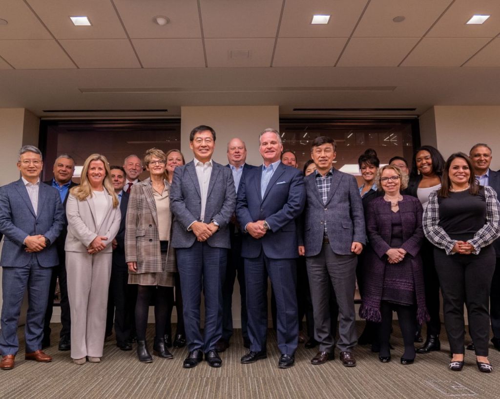 신학철 LG화학 부회장(앞줄 왼쪽에서 네번째)과 마이클 베일리 아베오 대표(앞줄 왼쪽 다섯번째), 손지웅 LG화학 생명과학본부 사장(앞줄 맨 왼쪽) 등 LG화학과 아베오 임직원들이 만나 기념사진을 촬영하고 있다. [사진제공=LG화학