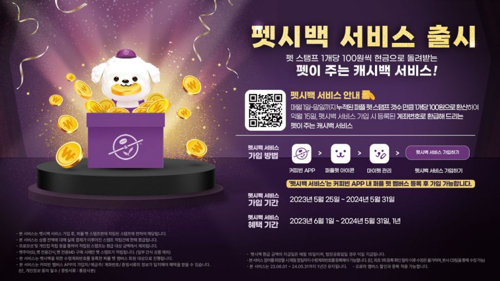 한편 국내 프랜차이즈 최초 펫 회원제 서비스인 퍼플 펫 멤버스와 더불어 커피업계 최초 환급형 서비스를 제공하는 것은 현재 커피빈이 유일하다.