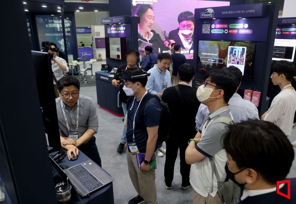 서울 코엑스에서 2일까지 열리는 글로벌 스타트업 페어인 2023 넥스트라이즈 전시장에서 한 관람객이 산업 현장용 스마트글라스를 착용하고 설명을 듣고 있다. 허영한 기자 younghan@