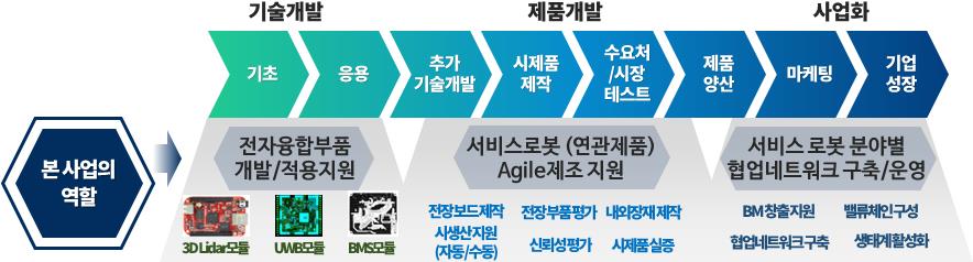 ‘서비스 로봇용 전자융합부품 Agile제조실증 기반구축’ 사업은 서비스 로봇용 전자융합부품·모듈 적용제품 연관기업의 공동 활용이 가능한 인프라를 구축하고 부품제조기술을 지원하는 사업이다.