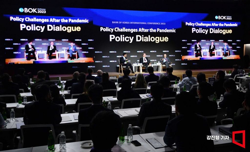 이창용 한국은행 총재가 1일 오전 서울 중구 한국은행 별관에서 '팬데믹 이후의 정책과제(Policy Challenges After the Pandemic)'라는 주제로 열린 2023년 BOK 국제컨퍼런스에 참석해 정책 대담을 하고 있다. 왼쪽부터 이창용 한국은행 총재, 나라야나 코처라코타 교수, 토마스 사전트 교수. 사진=사진공동취재단